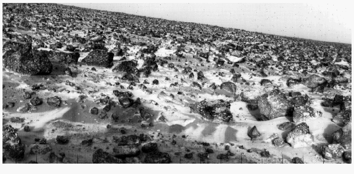 This high resolution photo of the surface of Mars was taken by Viking Lander 2 at its Utopia Planitia landing site on May 18, 1979, and relayed to Earth by Orbiter 1 on June 7th. It shows a thin coating of water ice on the rocks and soil. The time of the frost appearance corresponds almost exactly with the build up of frost one Martian year (23 Earth Months) ago.(NASA)