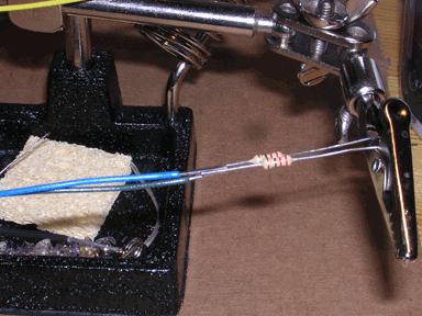 We started soldering LEDs to wires to make the legs longer and sodering the 220 Ohm resistors directly to the power leg of the LEDs, in oder to make them easier to put together on the board.