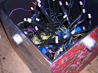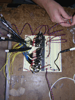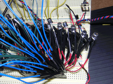 The first major issue we came upon was a logistical one. We chose to use 36 tri-color LEDs, each of which had four leads, three of which needing resistors and all of which requiring extra lengths of wire. We came up with a system of creating LED flowers groups of 8 LEDs that could be plugged into the breadboard with homemade sockets, but the sheer amount of soldering and cutting of wire was daunting. I estimate we put in 30 hours total just putting together the LED flowers. This limited the scope of the project and prevented us from, in the end, extending the project by creating more interesting control systems and ways of creating patterns with the LED lights, unfortunately.
