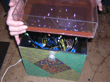 We placed the device in a box we made that was intended to look classic, non-techie and organic, and built a lid filled with liquid (Vitamin Water). We used origami paper that we cut and carefully glued on the side of the plastic box. Each side has a shade, representing either red/green or blue. We added the water element to the box ( water in a plexiglass case) that gives an 'underwater' effect, allowing the LED's to glow. We thought that this would make the effect more serene and natural, despite the tangle of technology inside.
